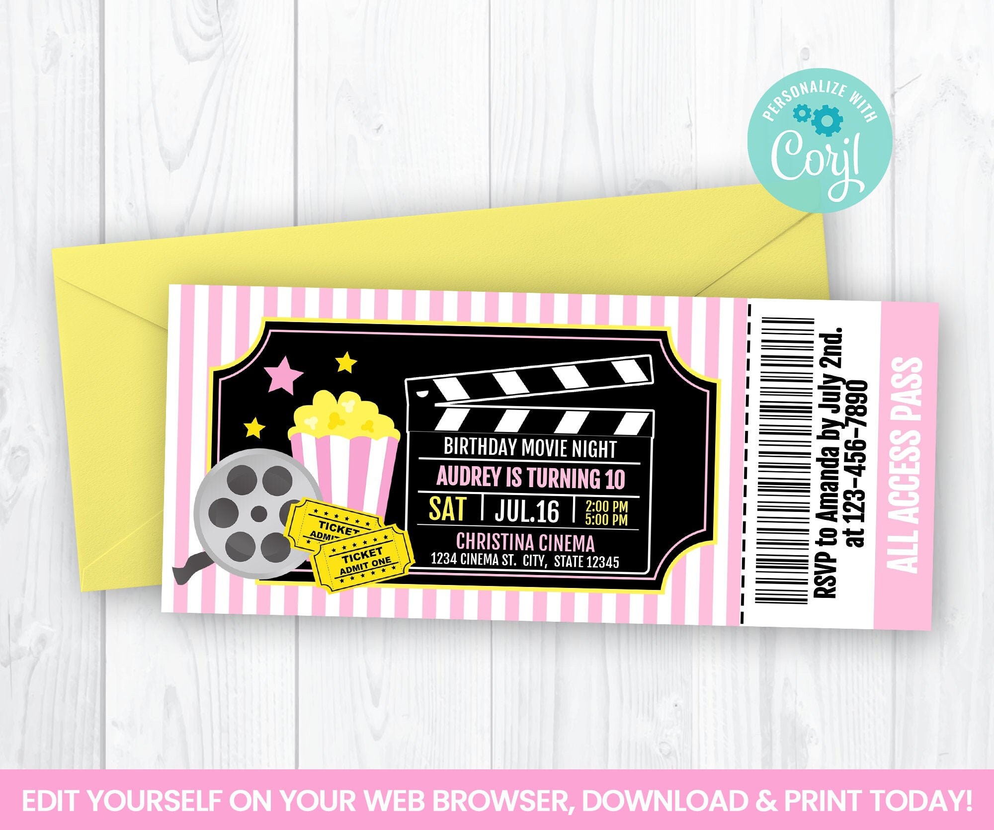 Editable Soft Pink Movie Night Ticket Invitation Cinema Girl Etsy